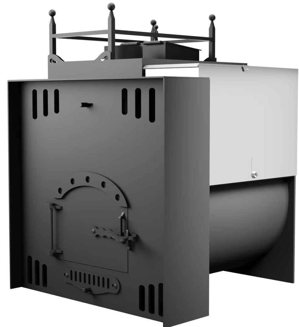 Печь Горыныч 3, каменка закрытая с парогенератором с левой стороны, большая дверь со стеклом